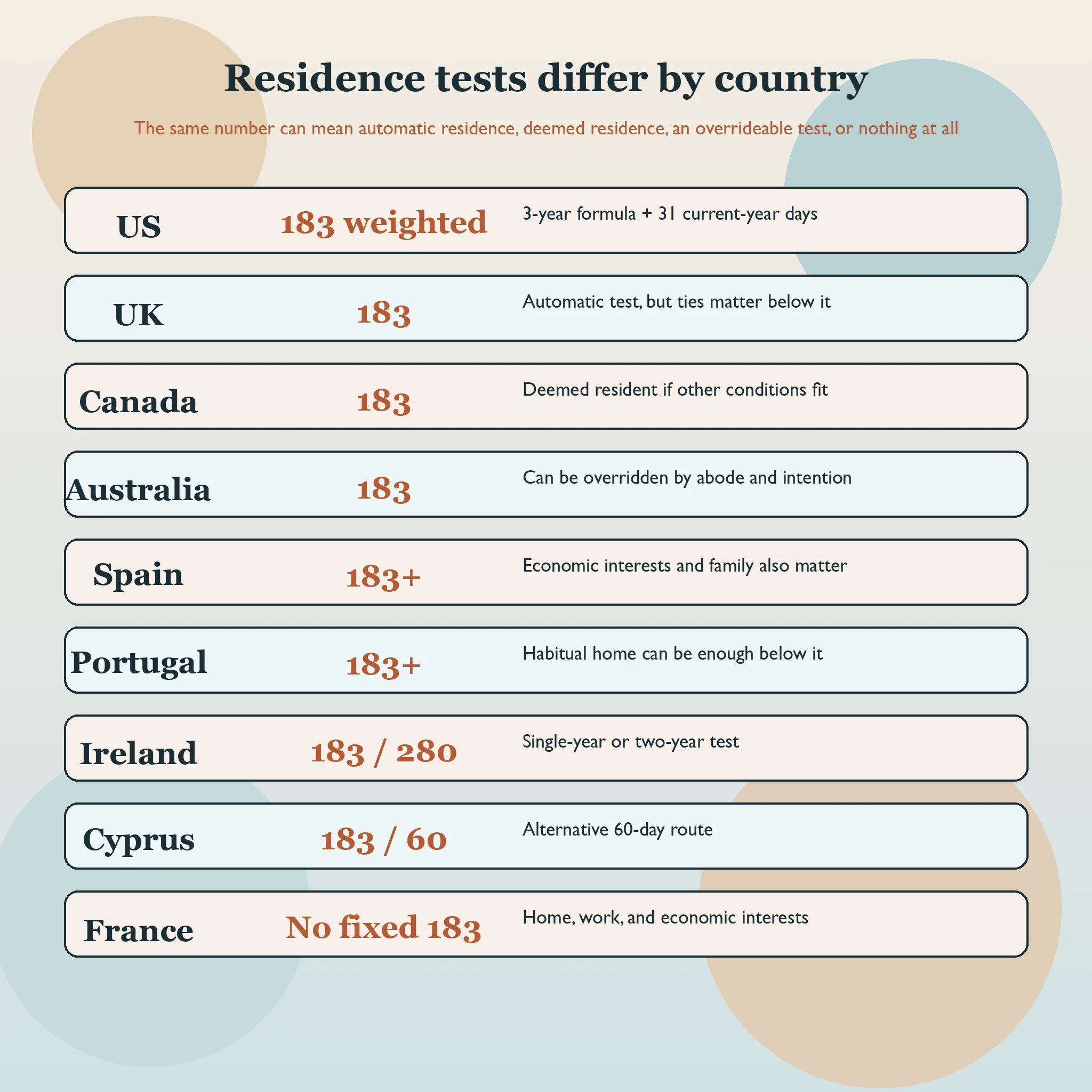 | "183 days is an international standard." | The U.S. uses a weighted 3-year test, Ireland also uses a 280-day 2-year rule, Cyprus has a 60-day route, and France does not rely on a simple 183-day domestic rule. | There is no single global threshold. |
