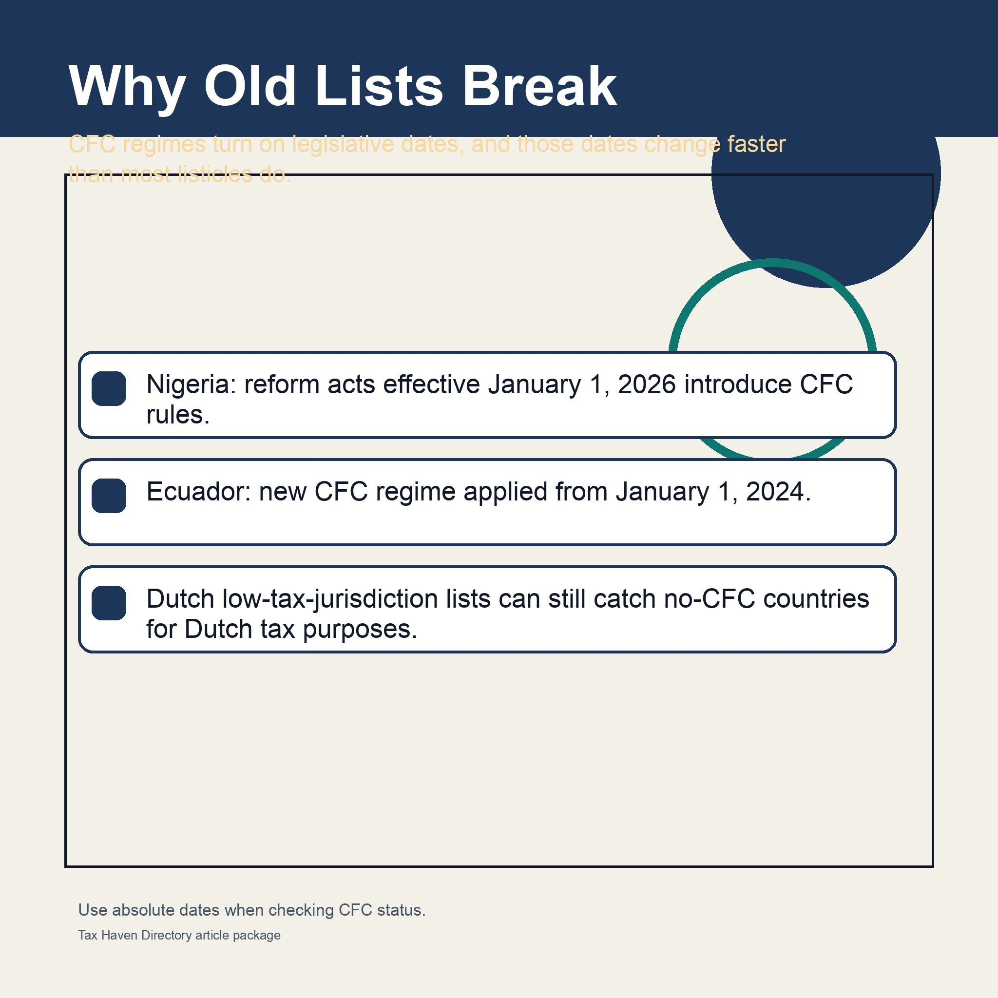 The fastest way to get this topic wrong is to use relative dates like “currently” without checking legislation. CFC regimes move by reform bill, and a list that was right in late 2024 can be wrong now. Nigeria is the best current example. PwC's Nigeria significant developments page says tax reform acts effective on January 1, 2026 introduced CFC rules that tax undistributed profits of foreign entities and permanent establishments under specified conditions. That means any “Nigeria has no CFC rules” article written before that date is stale now.