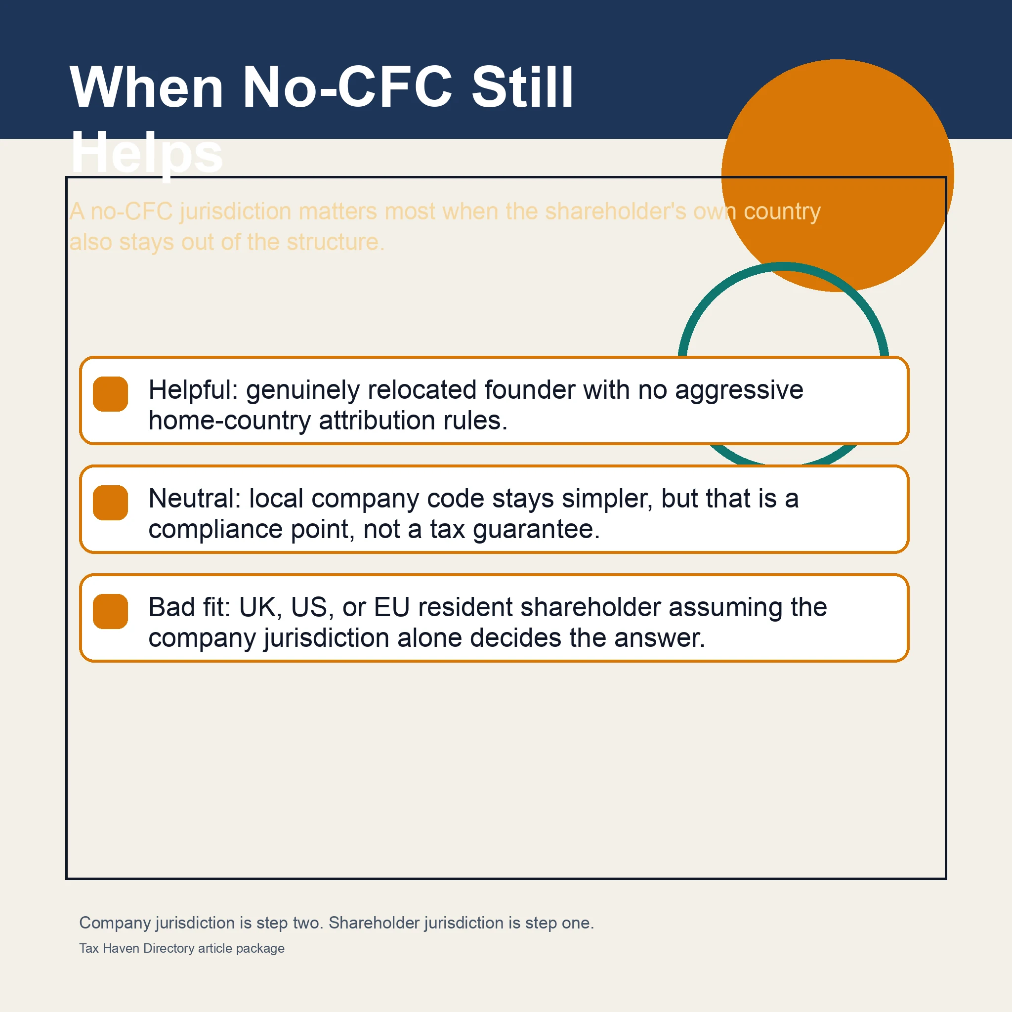 None of this makes the absence of CFC rules irrelevant. It still matters in the right fact pattern. A no-CFC jurisdiction can keep the local company code simpler, preserve retained-profit deferral where the shareholder's own country also stays out of the way, and make sense for founders who have genuinely relocated into a source-based or otherwise light residence system.
