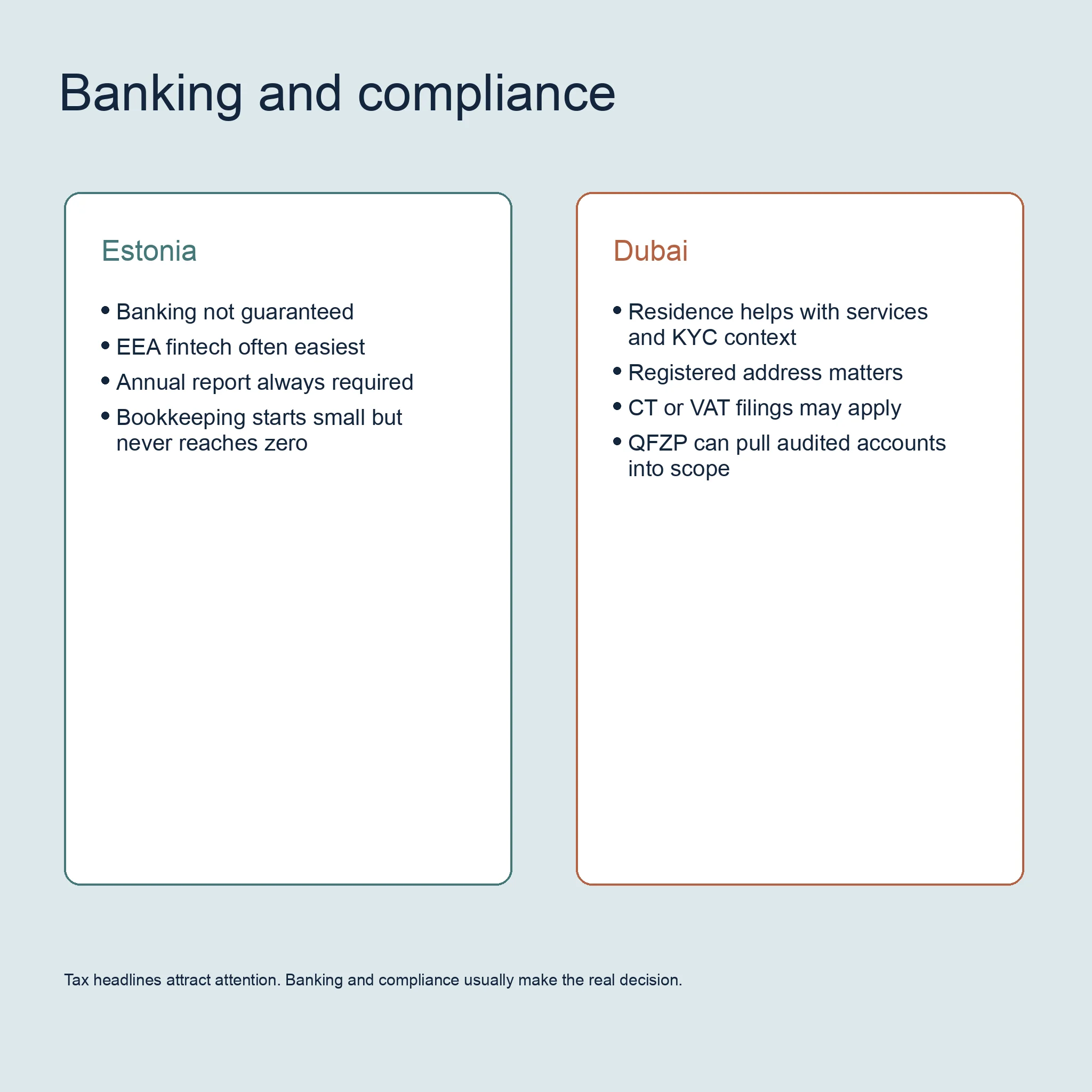 That last point deserves emphasis. Estonia is a practical, compliant remote-company system. Dubai is a practical, compliant operating base. Both work best when the founder's facts line up with the structure. Both become fragile when they are used as shortcuts around personal tax residency, substance, or commercial reality.