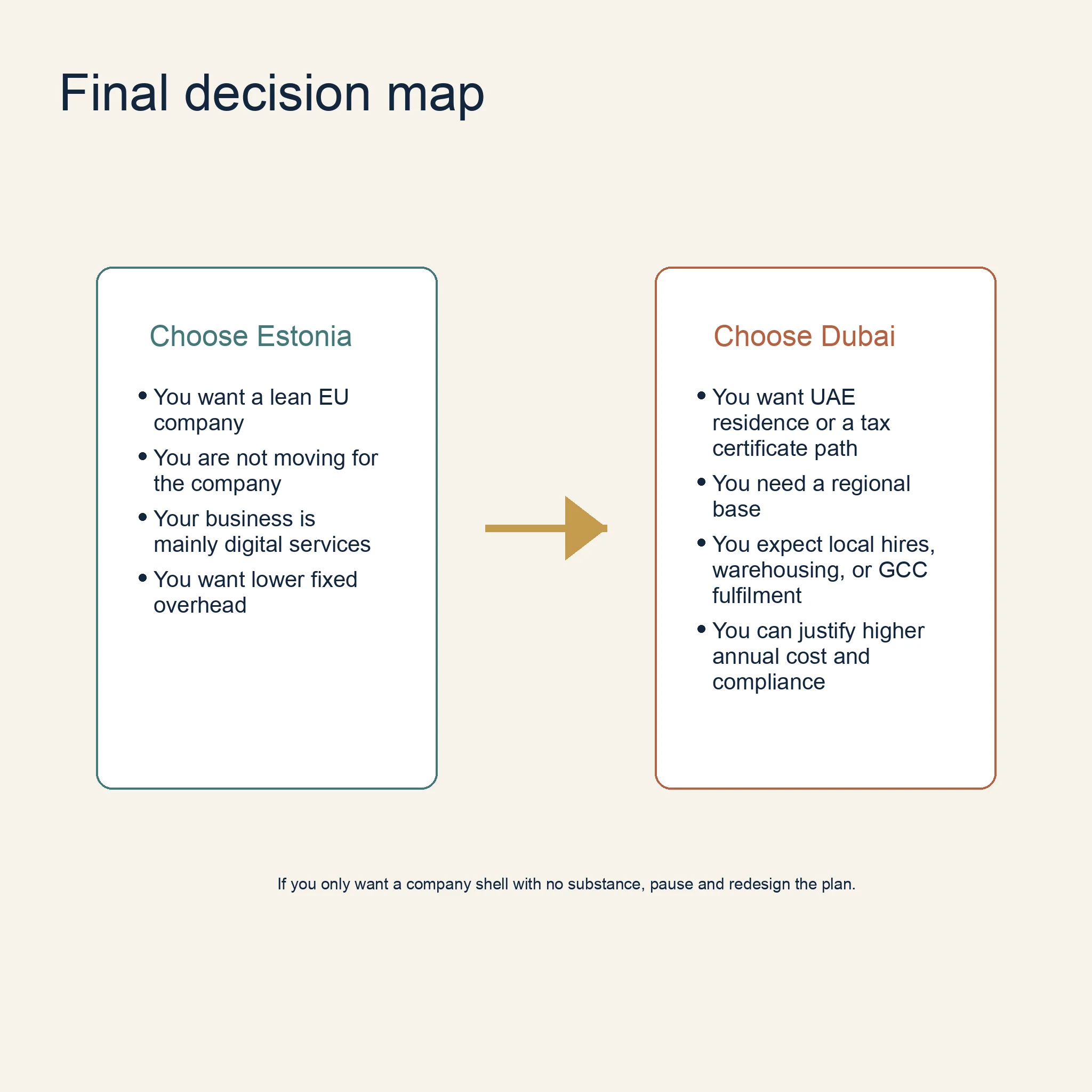 That is why the decision is often less about tax rates than about where you want your life and company to touch the ground. If nowhere, Estonia has the edge. If the answer is Dubai, and you mean it, Dubai starts to justify itself very quickly.
