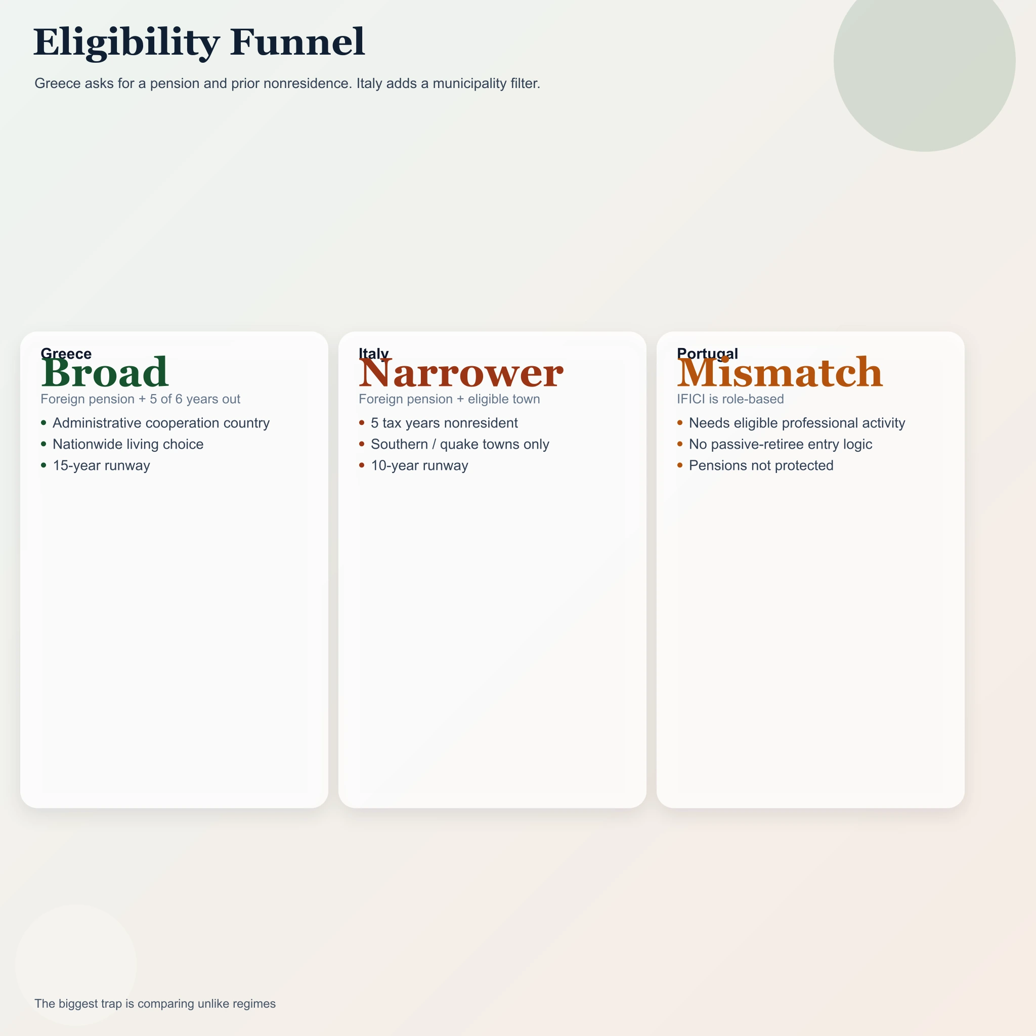 | Main hidden risk | Assuming Greek-source income also gets 7% | Assuming you can live in any Italian city | Assuming IFICI replaced NHR for retirees |