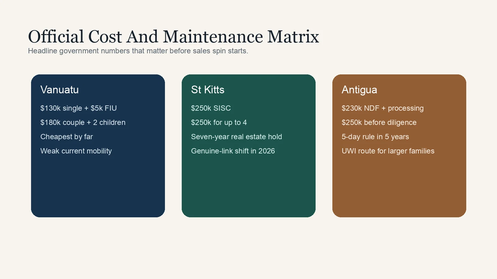 The harsh but useful conclusion is that Vanuatu is the price play, St Kitts is the credibility play, and Antigua is the family play. Which one is “best” depends on which of those three words matters most to you.