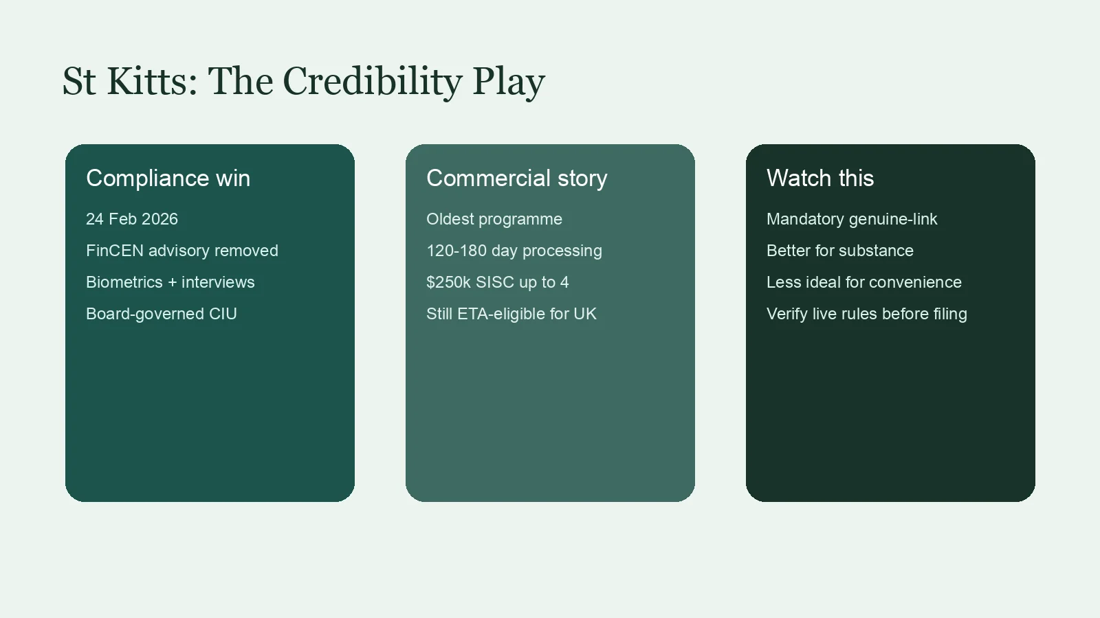 There is one catch, and it is not small. That same February 2026 CIU release says that in 2026 the programme will be redesigned to introduce a mandatory genuine-link requirement, including structured physical presence or residency, meaningful economic activity, productive investment, and longer-term engagement. If that change is fully implemented, St Kitts becomes better for people who want substance and worse for people who just want a pure convenience passport.