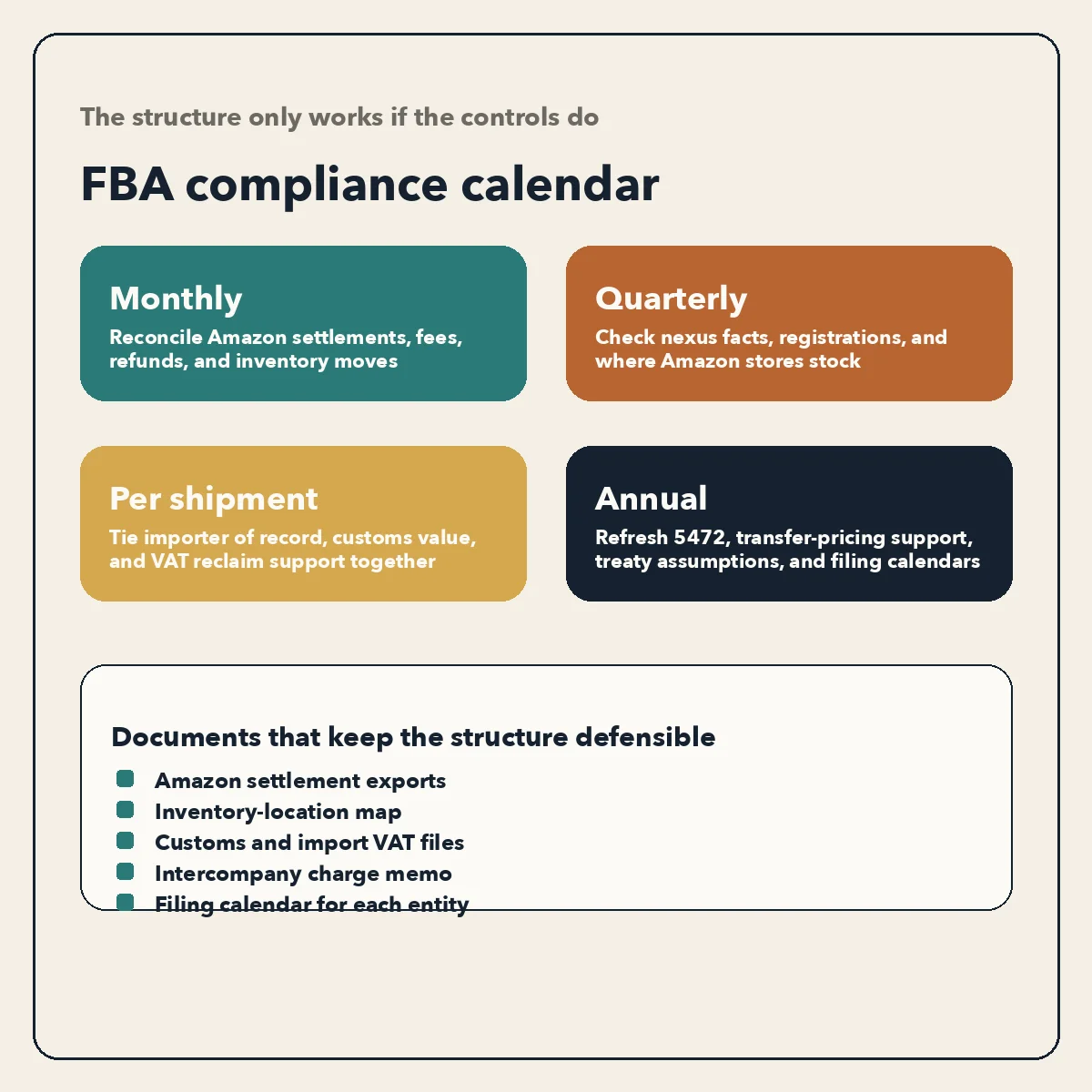 If you want the structure to hold, build a monthly control system around it. Export Amazon settlement reports. Reconcile marketplace fees, refunds, and inventory transfers. Keep a map of where Amazon may place stock. Store customs entries and import VAT documents beside the supplier invoice that created the shipment. If you use more than one entity, document the reason for every intercompany charge before year-end.