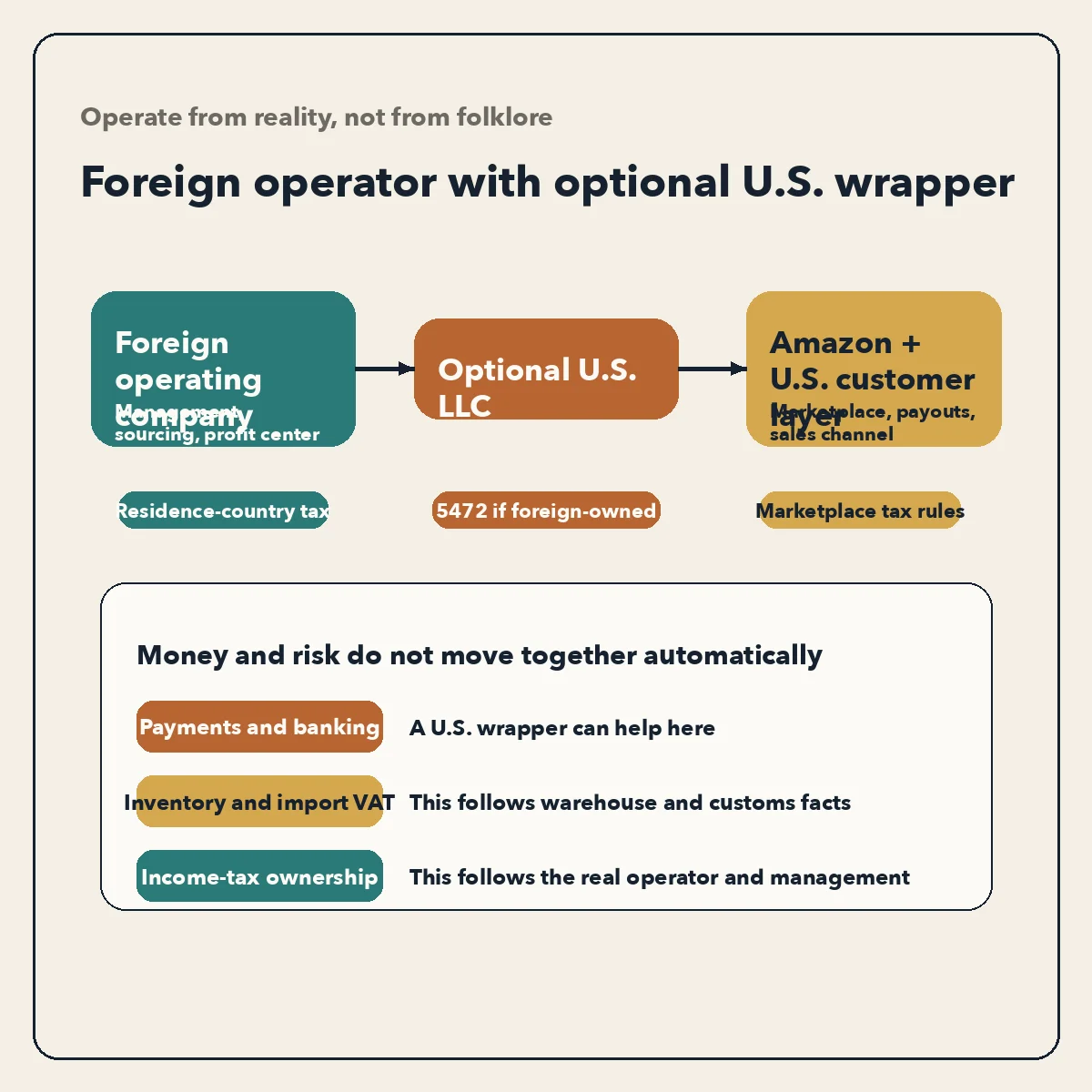 | Seller using Amazon as primary channel | Marketplace rules can handle part of the collection burden | Amazon does not solve residence-country tax | You avoid pretending platform operations change ownership of the business |