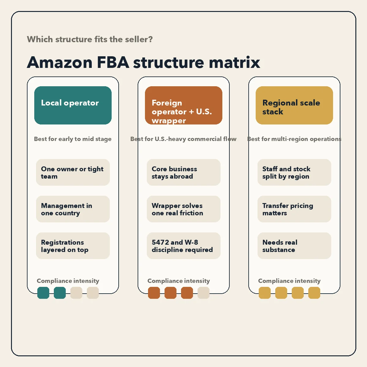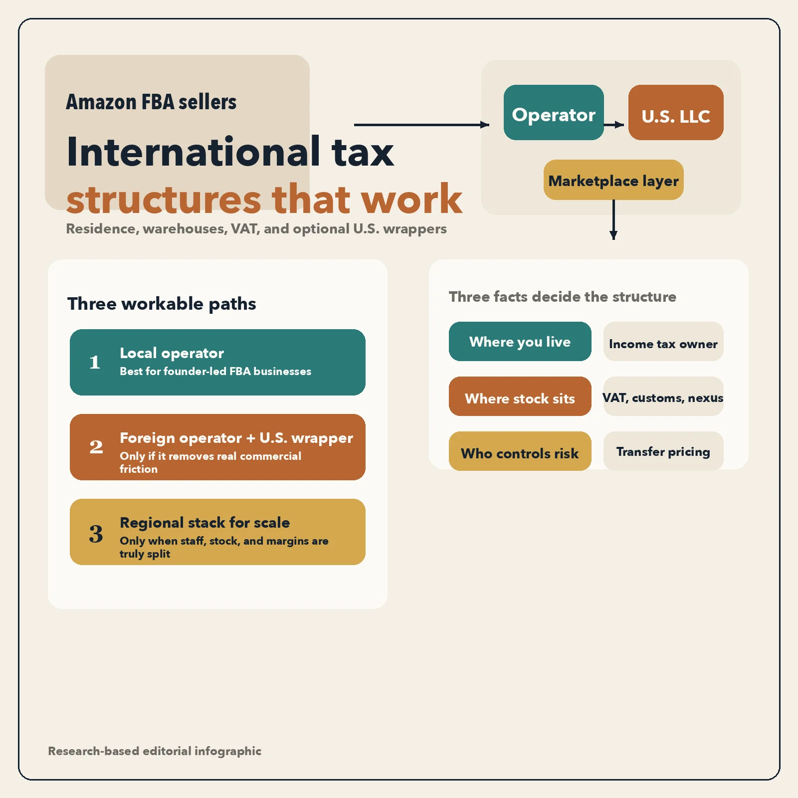 | Solo or founder-led FBA brand | Management, contracts, and profits stay in one place | Multiple indirect-tax registrations once inventory moves | The core income-tax answer is defensible and easy to explain |