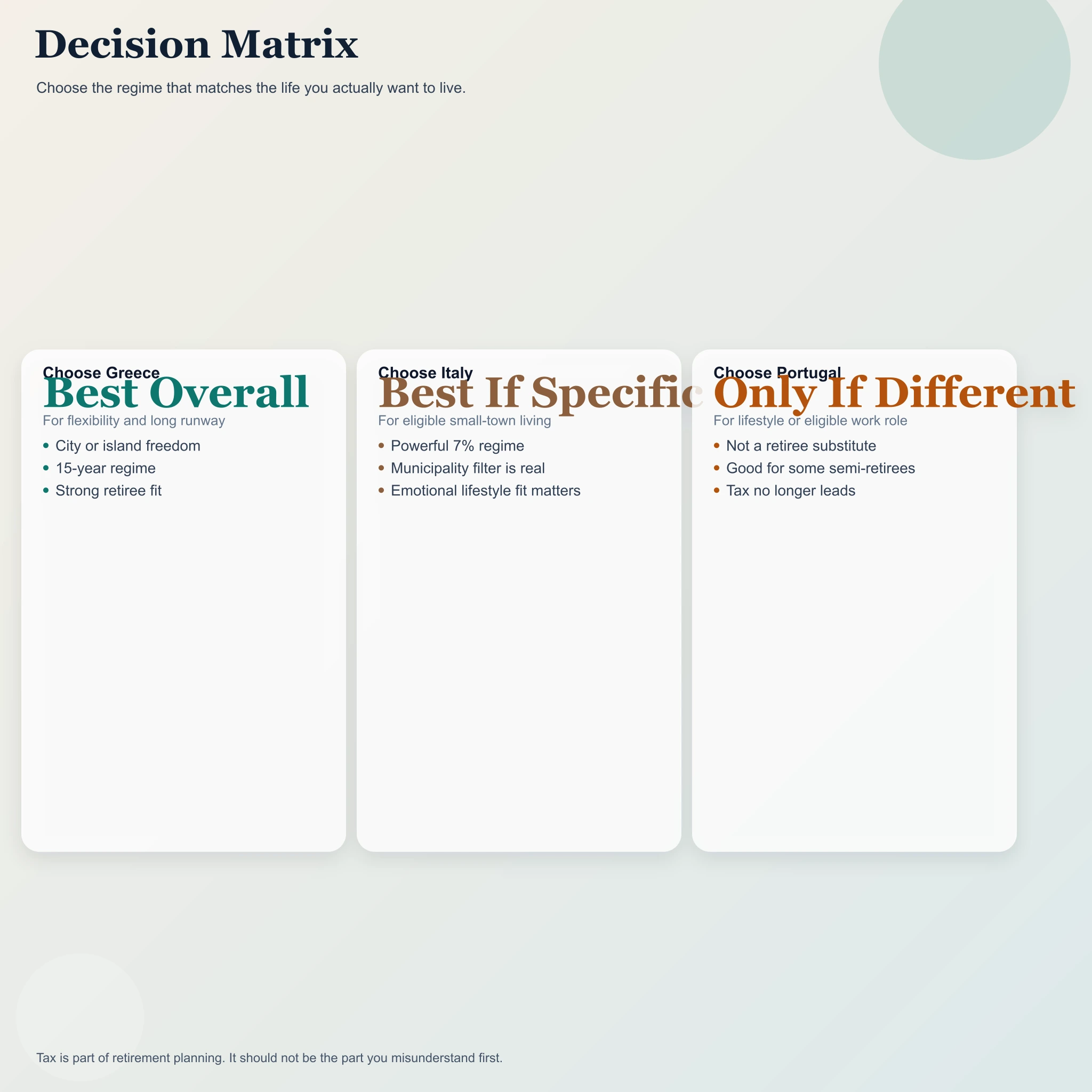 Choose Portugal only if your retirement story is not really a retirement story. Portugal still makes sense for founders easing into semi-retirement, researchers, certain executives, and other professionals who can legitimately access IFICI. What it no longer offers most new retirees is a clean headline pension deal comparable to Greece's or Italy's.