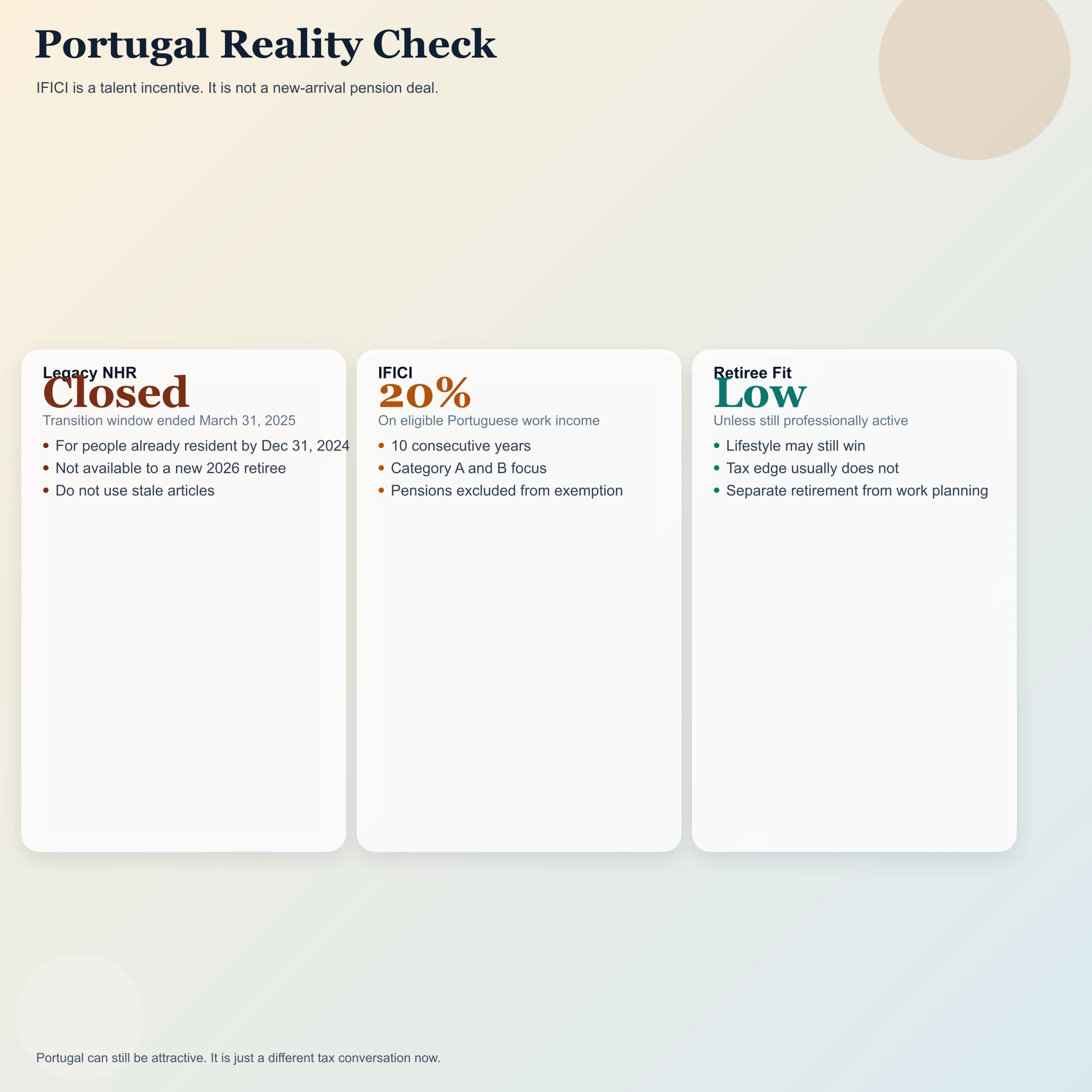 There is one narrow caveat. If you are not fully retired and can legitimately fit IFICI because you still work in an eligible role, Portugal may still work as part of a semi-retirement or founder plan. But that is no longer the same conversation as "Where should I move my pension?" It is a different profile entirely.