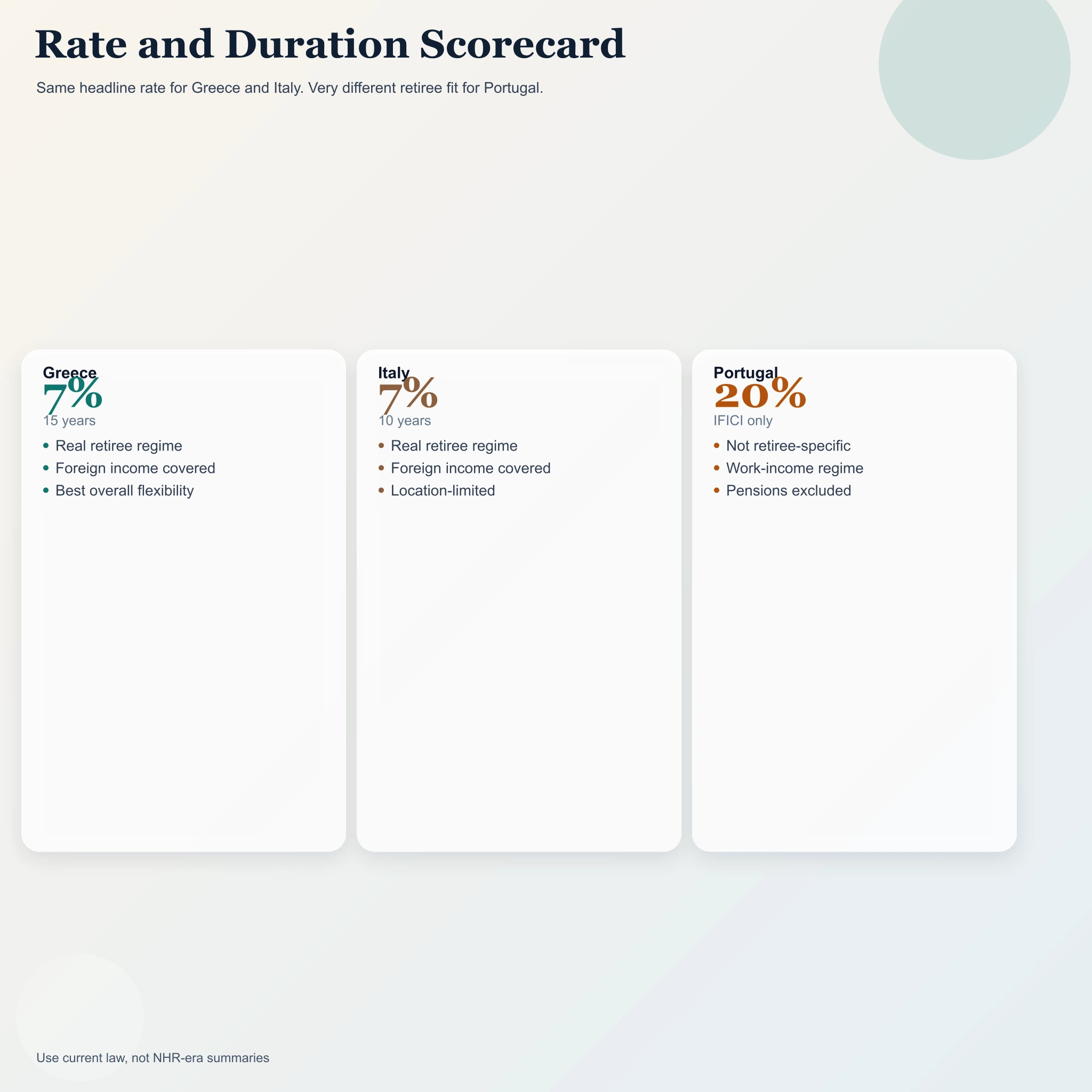 If you are choosing between Greece, Italy, and Portugal for retirement, the real question is no longer "which country has the lowest headline rate?" It is: