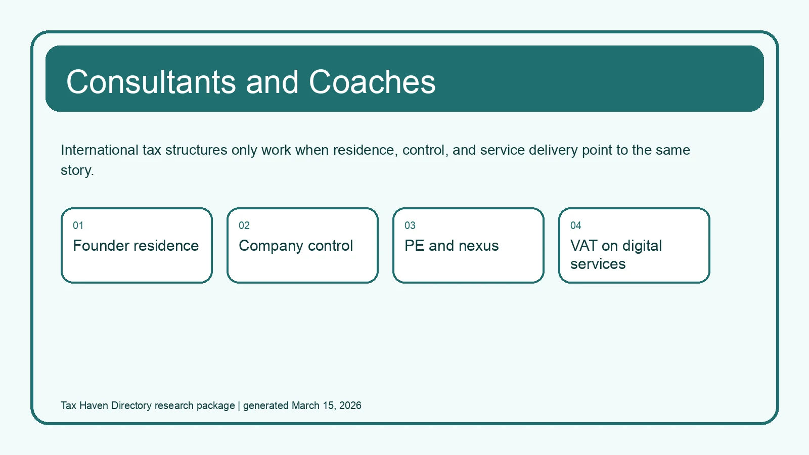 International tax planning sounds glamorous until you remember what consultants and coaches actually sell: their own time, judgment, reputation, and presence. That is active income. It follows people. It follows decision-making. It often follows the place where a client meeting happened, where a workshop was run, where proposals were approved, or where the founder sat while directing the whole business.