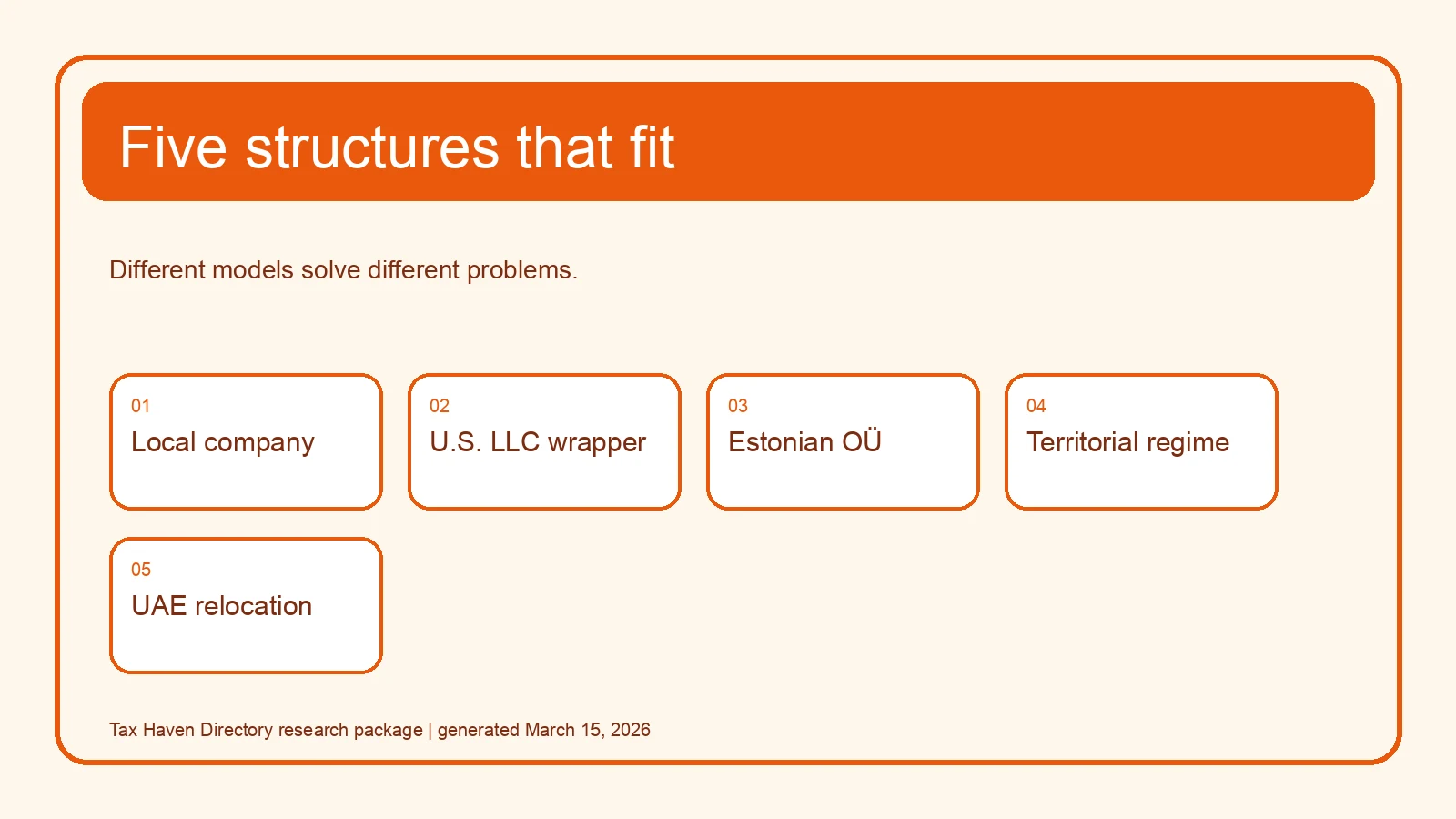 | U.S. LLC or other pass-through wrapper | Non-U.S. founders who need a familiar contract and banking wrapper | Entity flexibility and commercial convenience | Treating the wrapper as a magic tax residency reset |