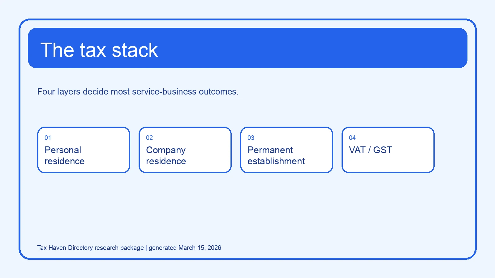 Before choosing any structure, map four layers. First, where is the founder personally tax resident? Second, where is the company resident because strategic control is exercised there? Third, where does the company create a local taxable footprint through a permanent establishment or similar nexus? Fourth, where are customers located for VAT, GST, or sales-tax purposes? That four-layer map is more valuable than a long list of low-tax jurisdictions.