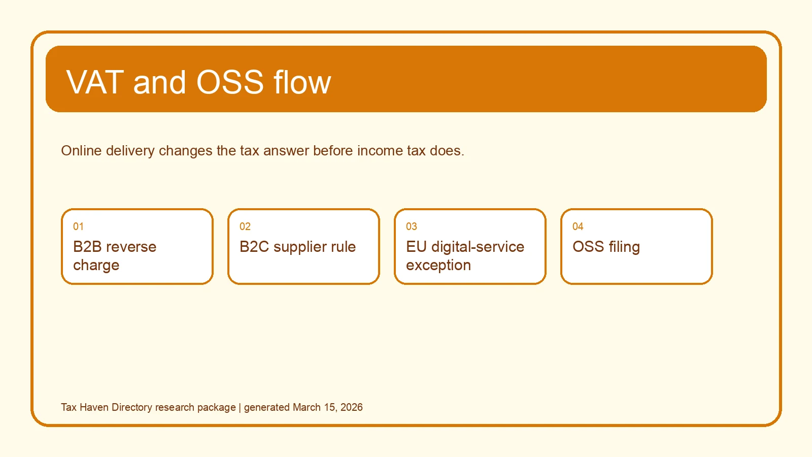 | Recorded course, app, or membership sold to EU consumers | Often taxed where the customer belongs | Evidence of customer location and whether OSS is available |