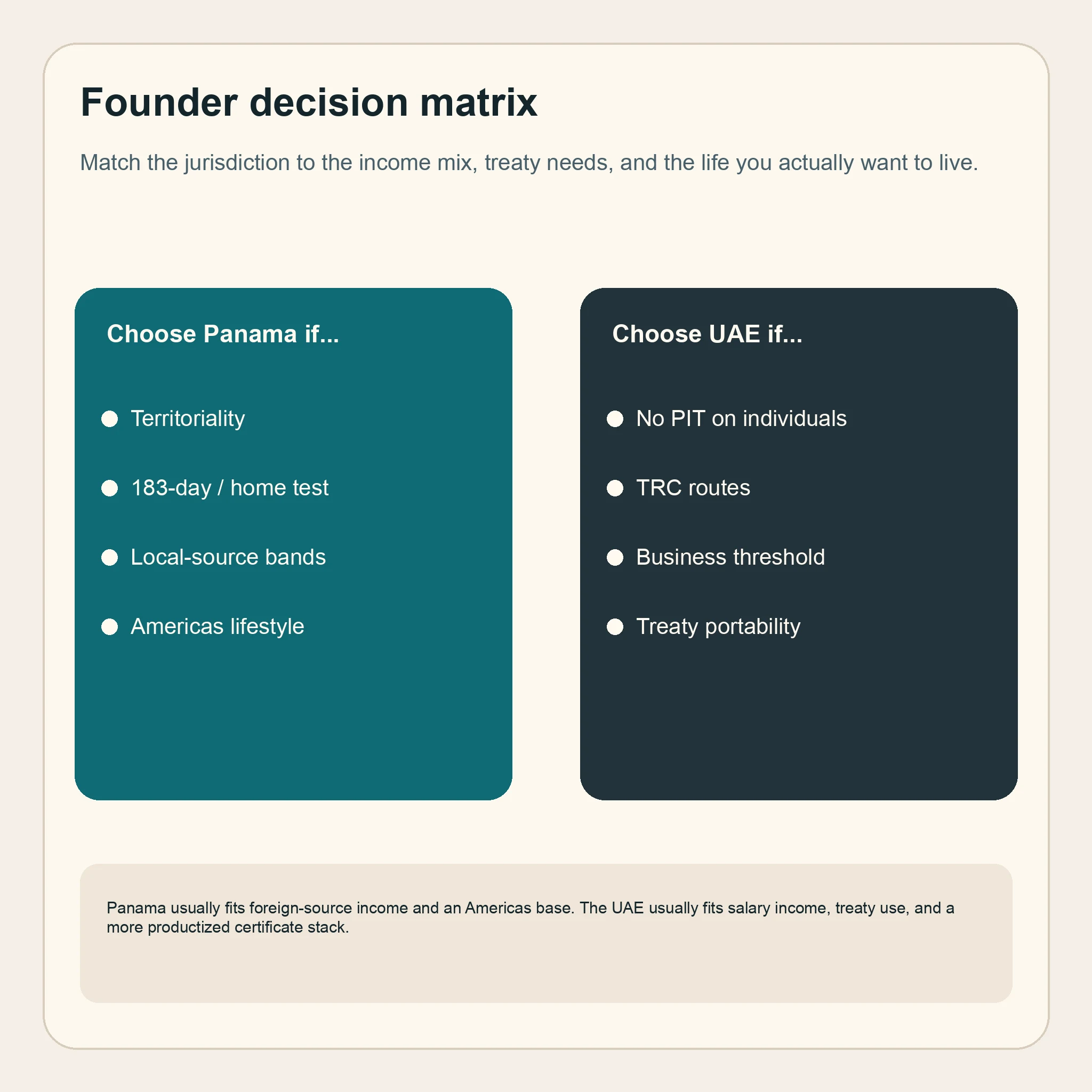 | Hyper-mobile founder who wants to spend very little time in the base | Neither by default | Panama usually wants a 183-day or permanent-home case; UAE has physical-continuity expectations and a six-month outside-country permit process | This profile needs a custom plan, not marketing slogans |