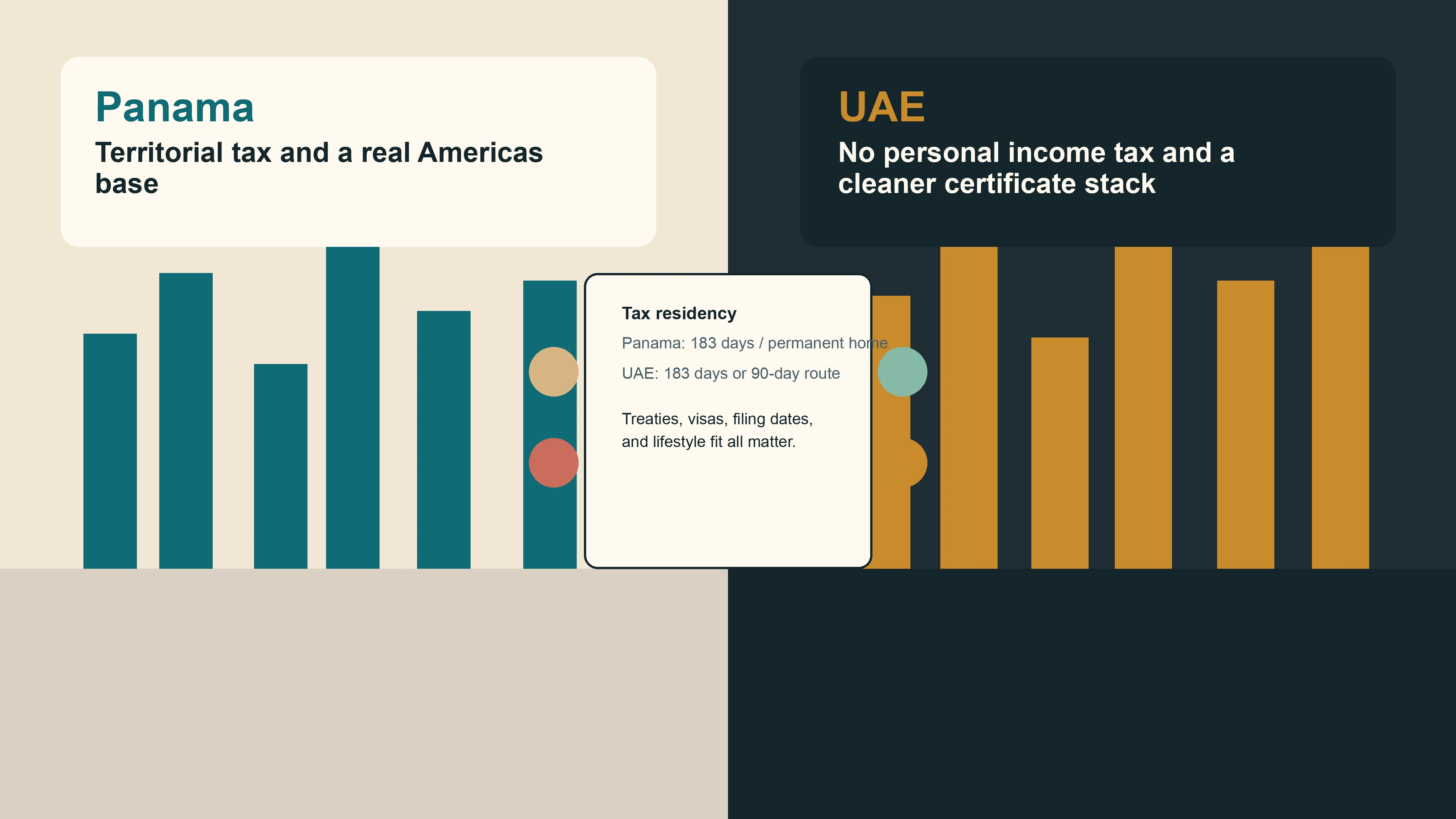 A useful shorthand is this: Panama feels broader and more residential. The UAE feels more systematized and certificate-friendly. If your main goal is tax residency only, the UAE often gets there faster. If your main goal is building a durable life base in the Americas, Panama has a stronger emotional and legal fit.