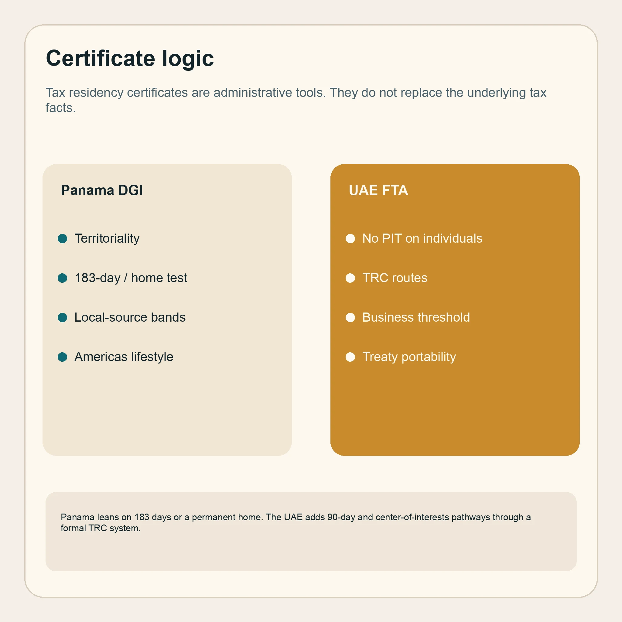 The UAE also has a more structured tax-residency-certificate process than Panama. The FTA tax-certificate service page allows applications for treaty purposes and for domestic purposes. The same official guidance describes residence tests built around 183 days, a 90-day route with residence and home or work/business connections, and a center-of-interests style route.