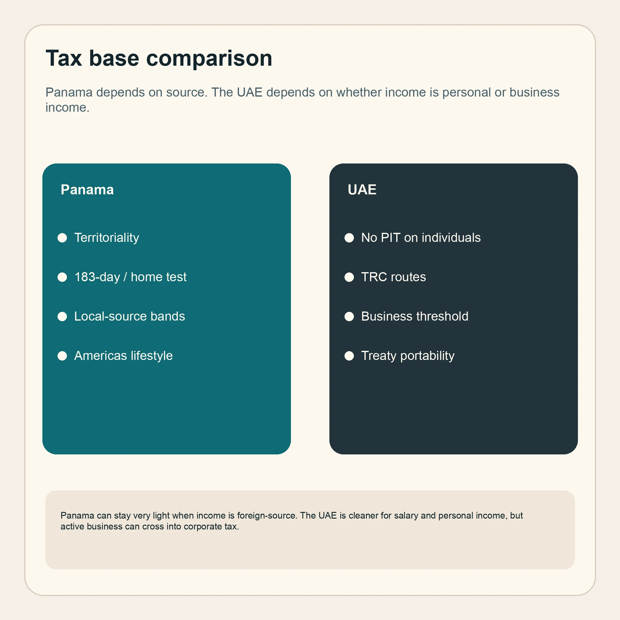 The official sources make that split clear. Panama's tax authority says the system follows the territoriality principle in Article 694 of the Fiscal Code and taxes only Panamanian-source income. The UAE government, by contrast, states that the country does not levy income tax on individuals, while the Federal Tax Authority separately explains when a natural person carrying on business can fall into corporate tax.