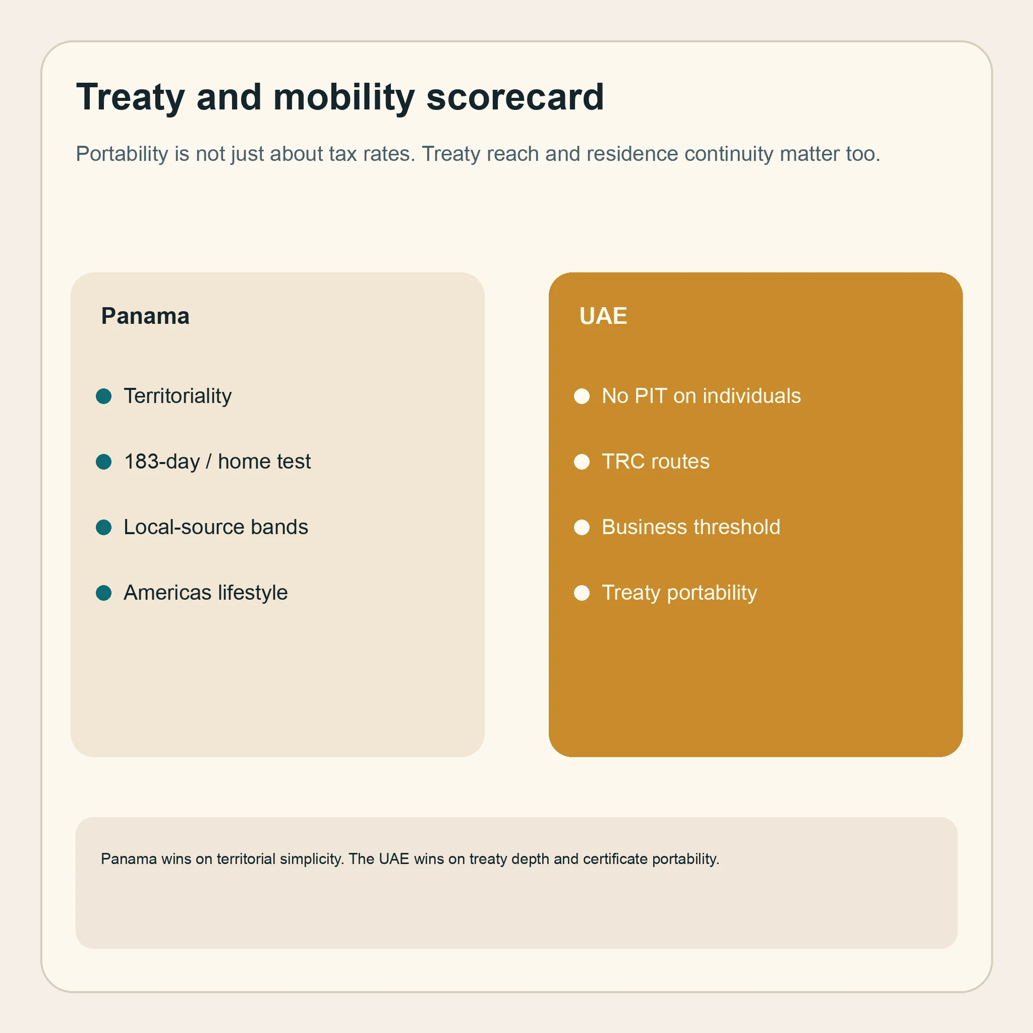 Panama is easier to like when your income is already foreign-source. The UAE is easier to like when you want the cleanest possible personal tax story and a certificate that travels better.